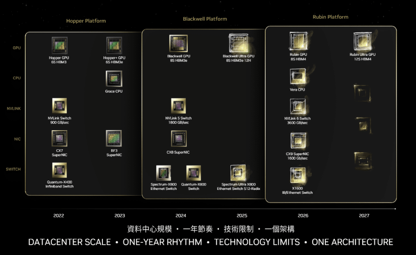 NVIDIA odottaa vuoden 2026 Rubin-prosessoriperheen julkaisua, joka tulee korvaamaan nykyisen Blackwell-arkkitehtuurin. Tämä uusi sukupolvi tuo mukanaan merkittäviä parannuksia suorituskyvyssä ja energiatehokkuudessa, ja se on suunniteltu vastaamaan kasvavaan tekoälyn laskentatehon tarpeeseen.