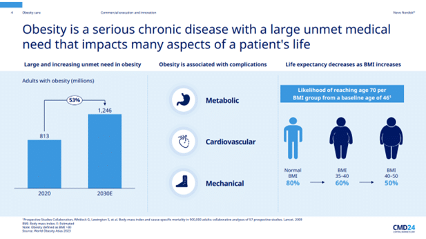 Ylipainoisten määrän uskotaan kasvavan maailmassa kovaa vauhtia vuoteen 2030 mennessä ja sillä on merkittävä vaikutus elinajanodotteeseen. Lisäksi ylipaino aiheuttaa muita vakavia sairauksia. Kuva: Novo Nordiskin pääomamarkkinapäiviltä.