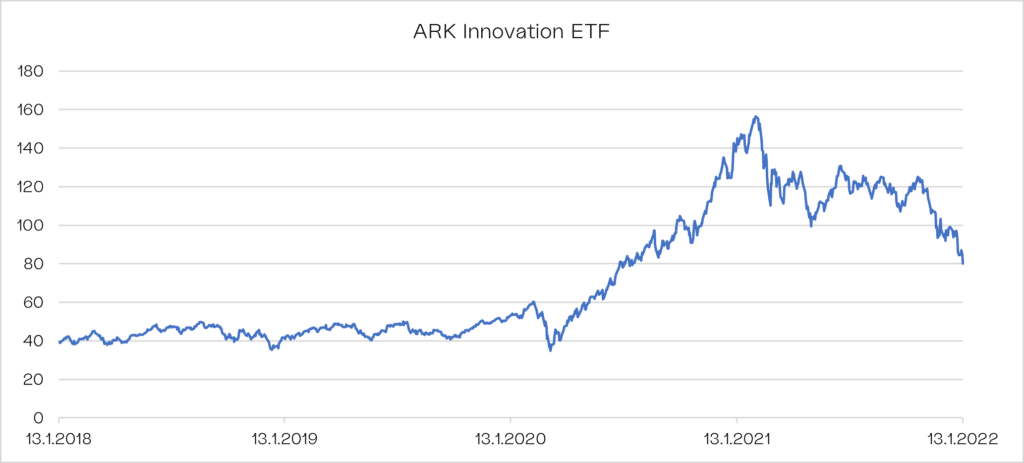 Kuva 2. ARK Innovation ETF tuottokehitys 5 v. Lähde: Bloomberg, Visio.